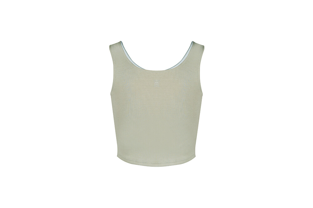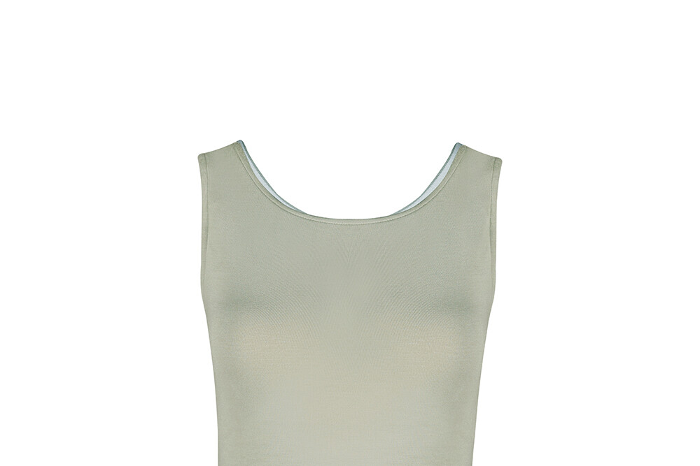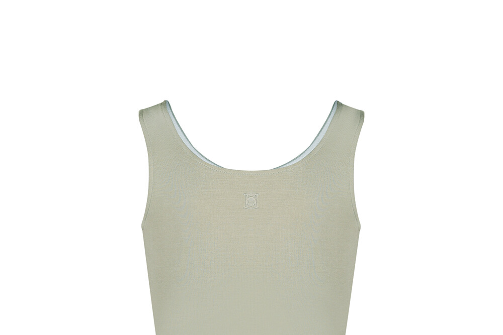 넥라인에 직기밴드를 넣고 보다 견고하게 봉제 (Clean finish) 하여 늘어짐이 없고
